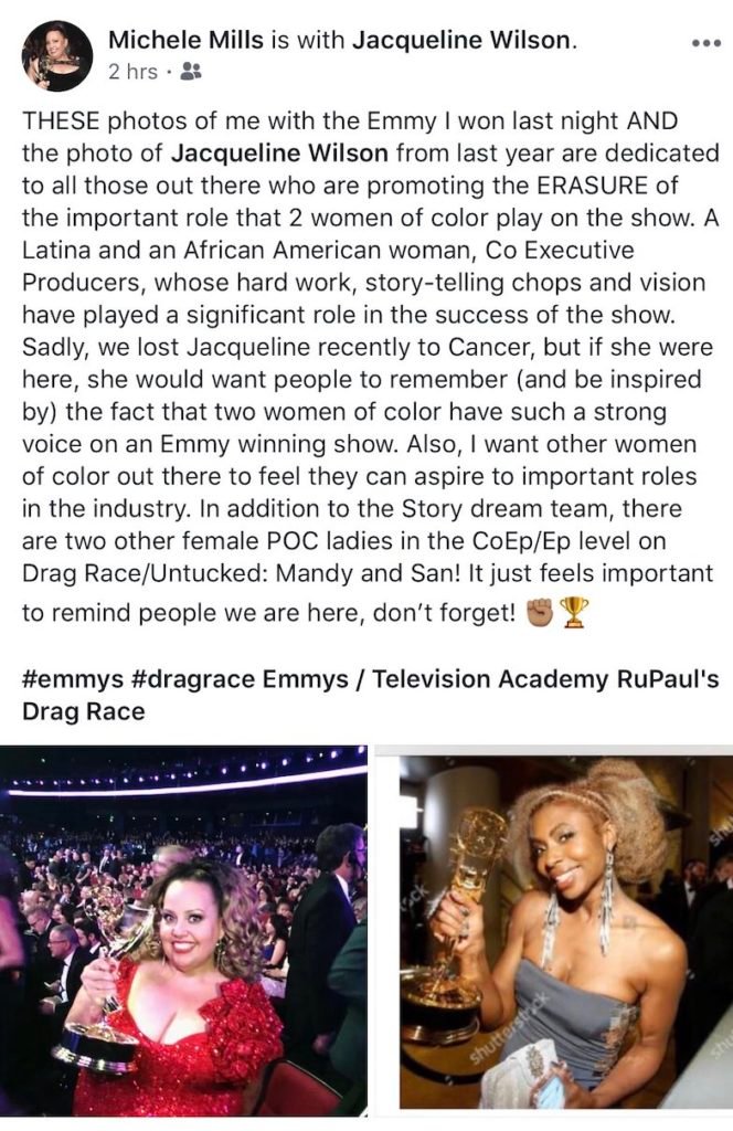 “Michelle Mills, RuPaul, Mandy Salangsang, Jamala Gaither, Alicia Gargaro-Magaña, Swaga Deb, San, and the late Jacqueline Wilson (who passed weeks before the Emmy Awards) all POC with producer credits on Drag Race,” she wrote.