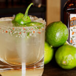 A Spicy Mango Jalapeño Margarita with Cointreau Orange Liqueur that combines sweet mango and vanilla orange with a zesty lime and a bold jalapeño kick, finished with a salted chili rim for an adventurous flavor experience.