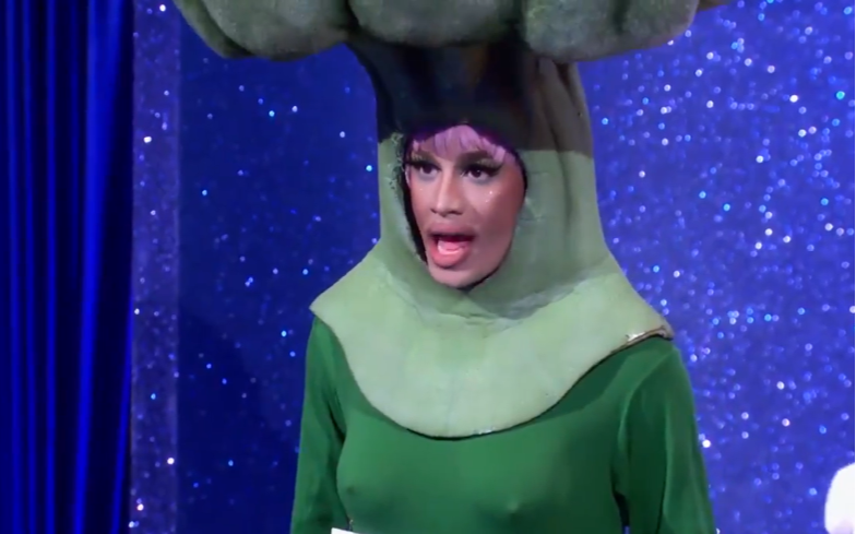 Despite her broccoli couture, the self-described “tattooed beauty doll” floundered in the challenge and found herself in the bottom two alongside Nicky Doll, where they lip synced for their lives to Ariana Grande and Iggy Azalea’s pop anthem, Problem.