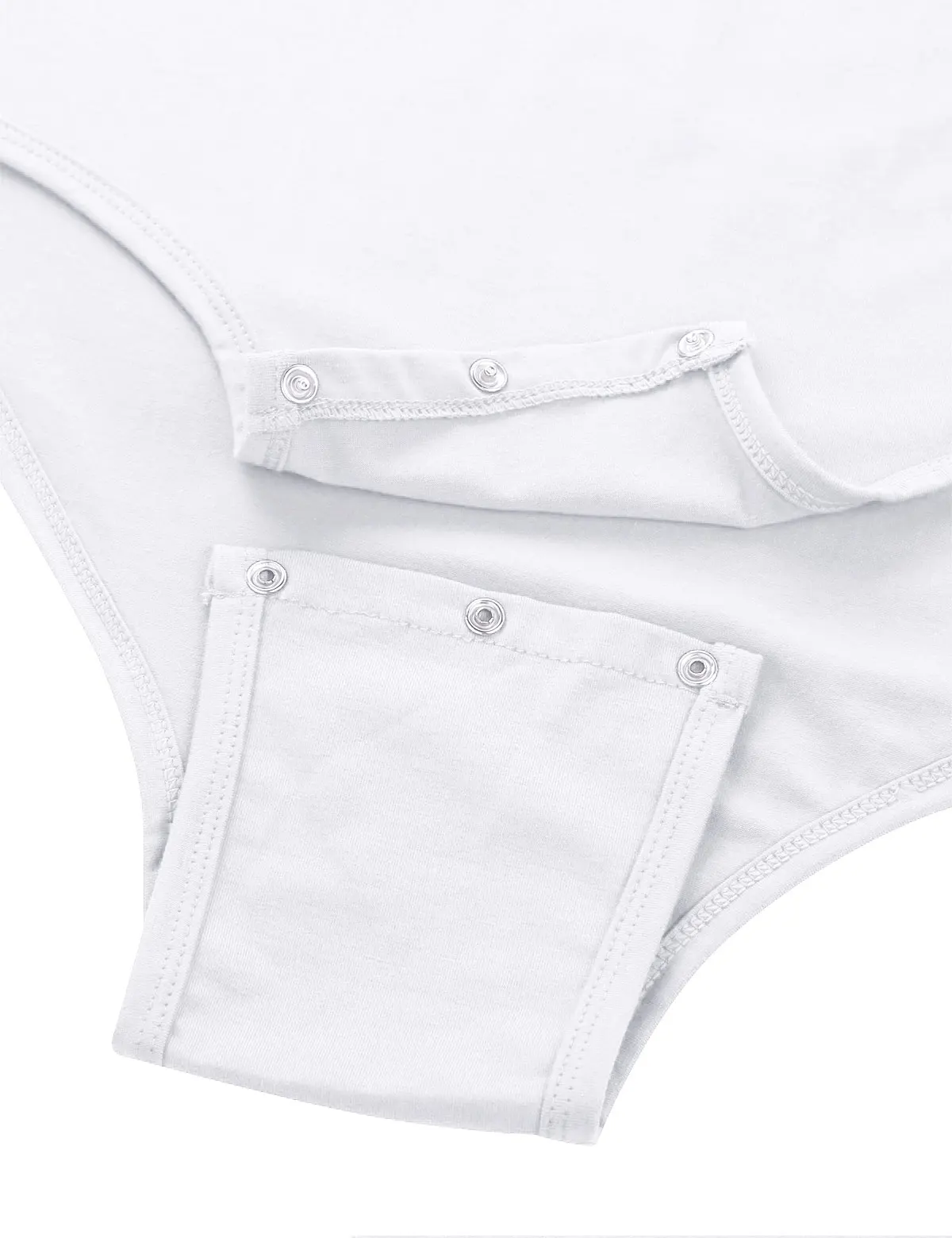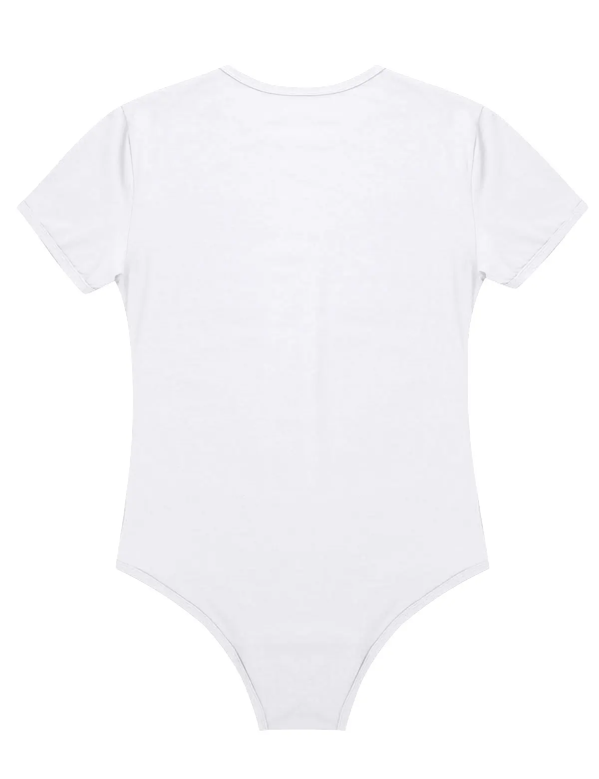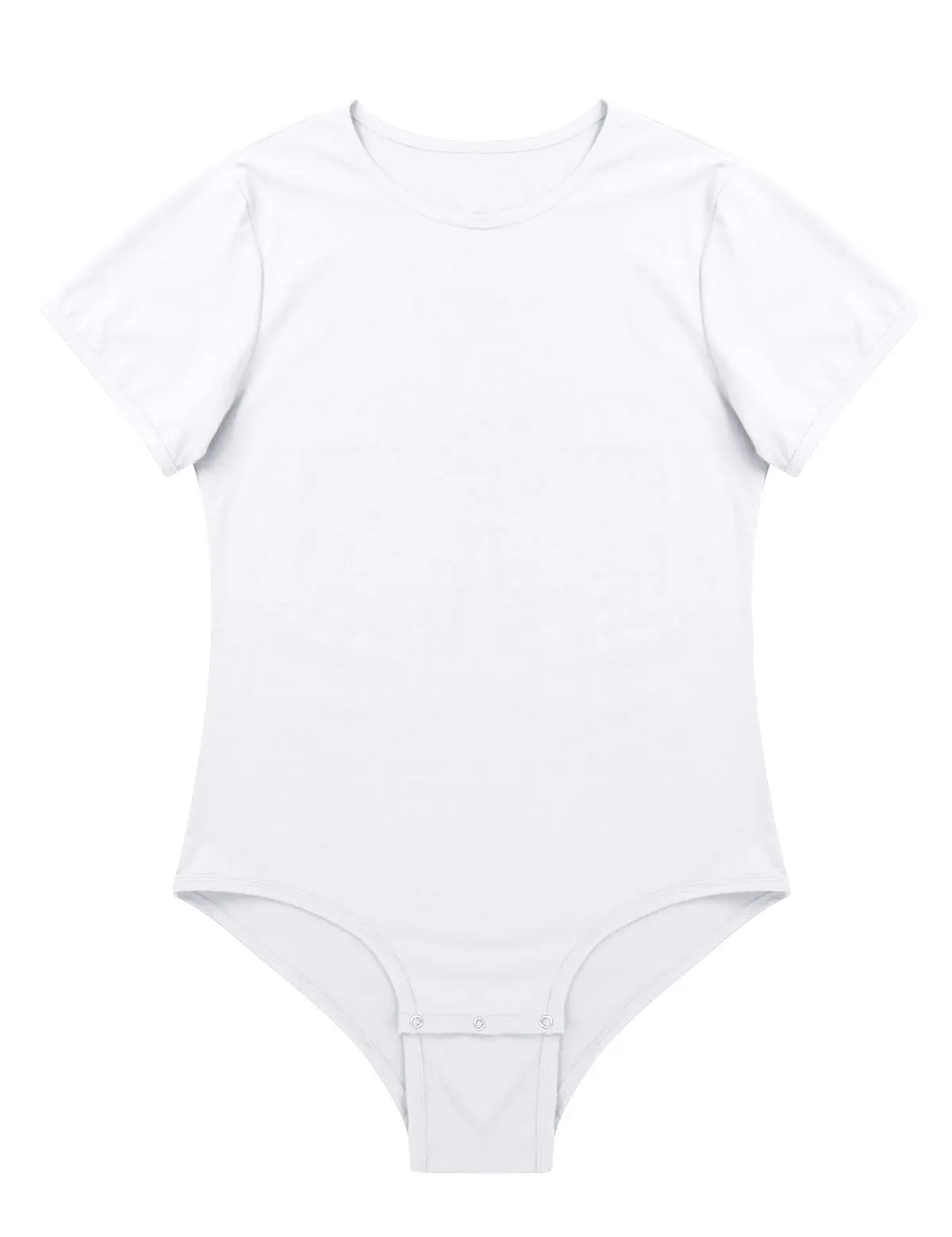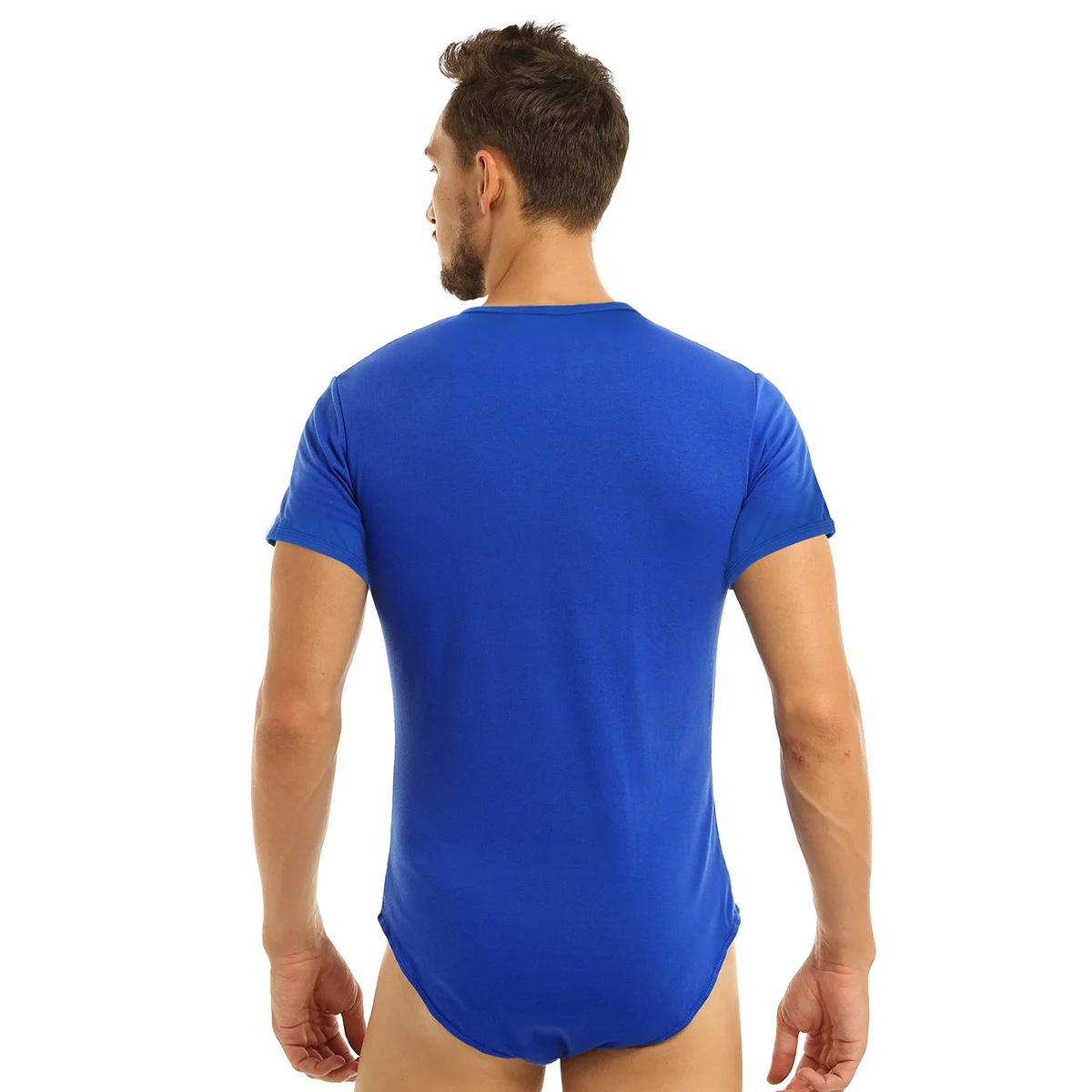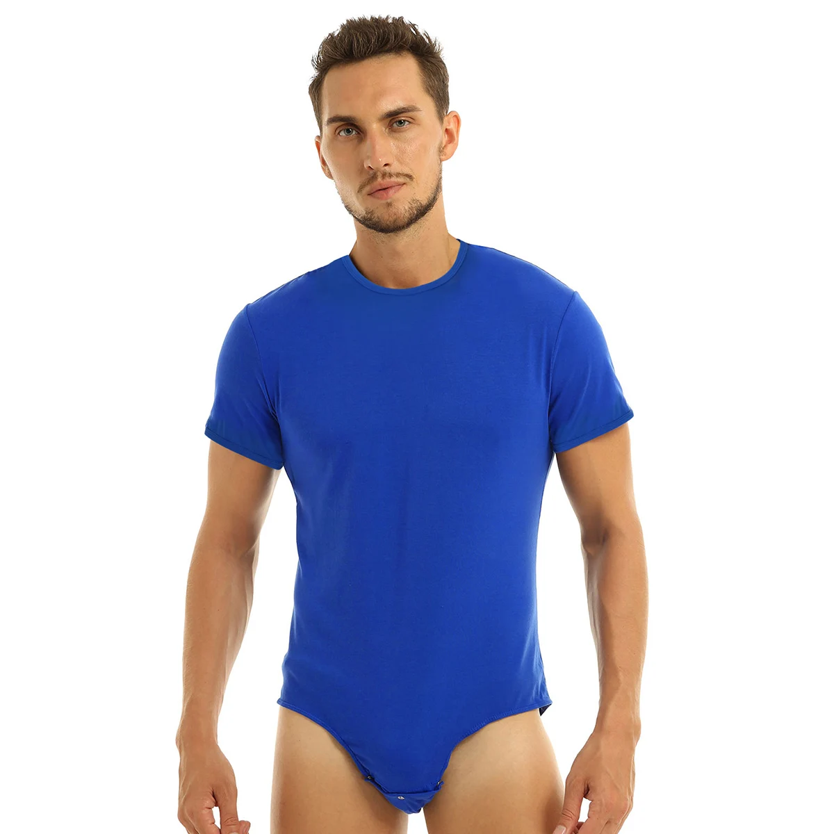 Short sleeves and round neck, men’s T-shirt design with three press buttons at crotch, solid color.