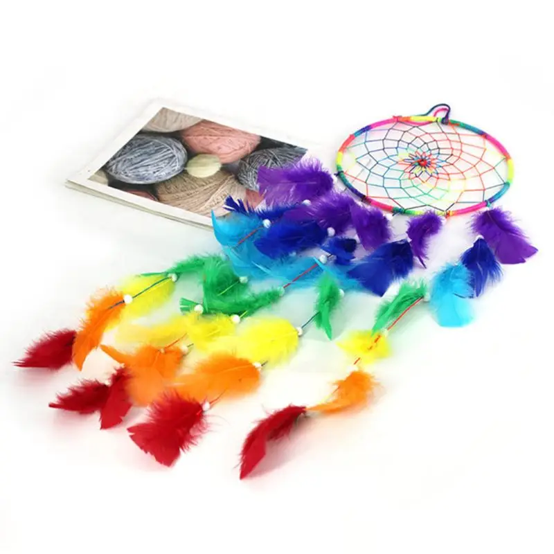 The middle of the disc is crocheted, the rainbow color feathers and the texture beads make the color dream catcher looks graceful and cheerful.