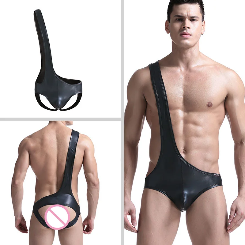 Faux Leather Asymmetrical Open Butt Gay Singlet