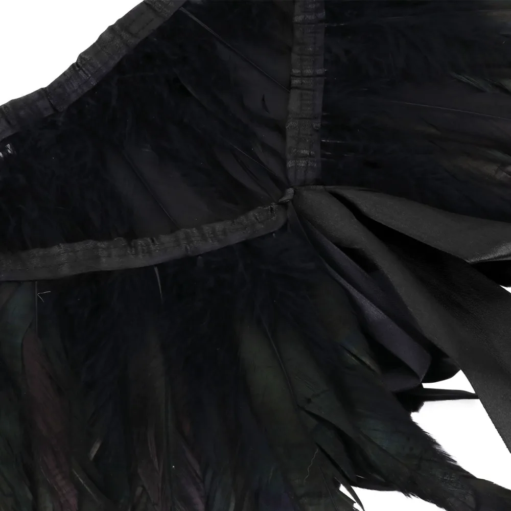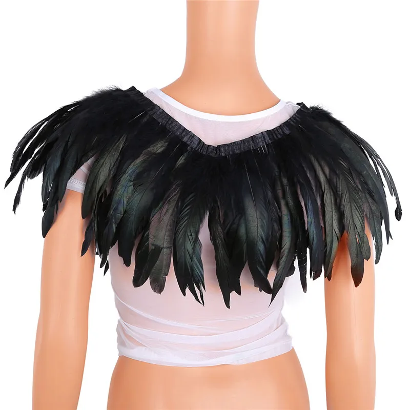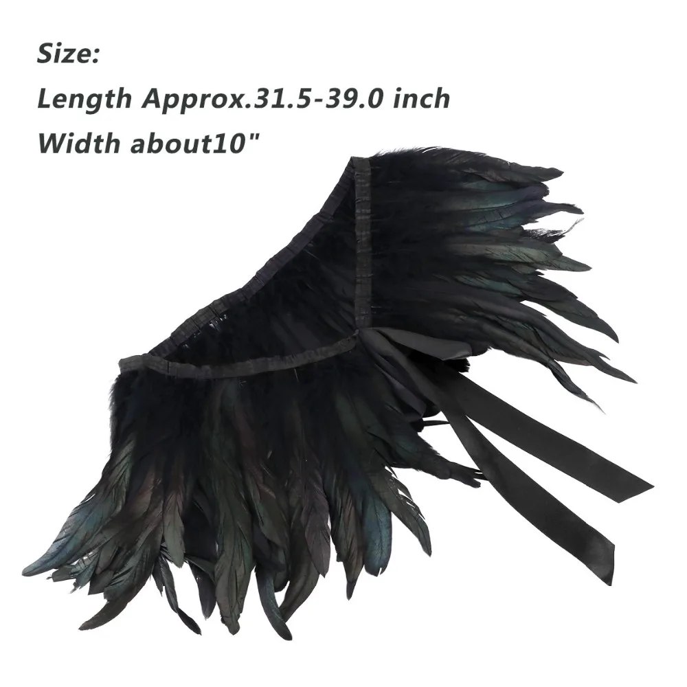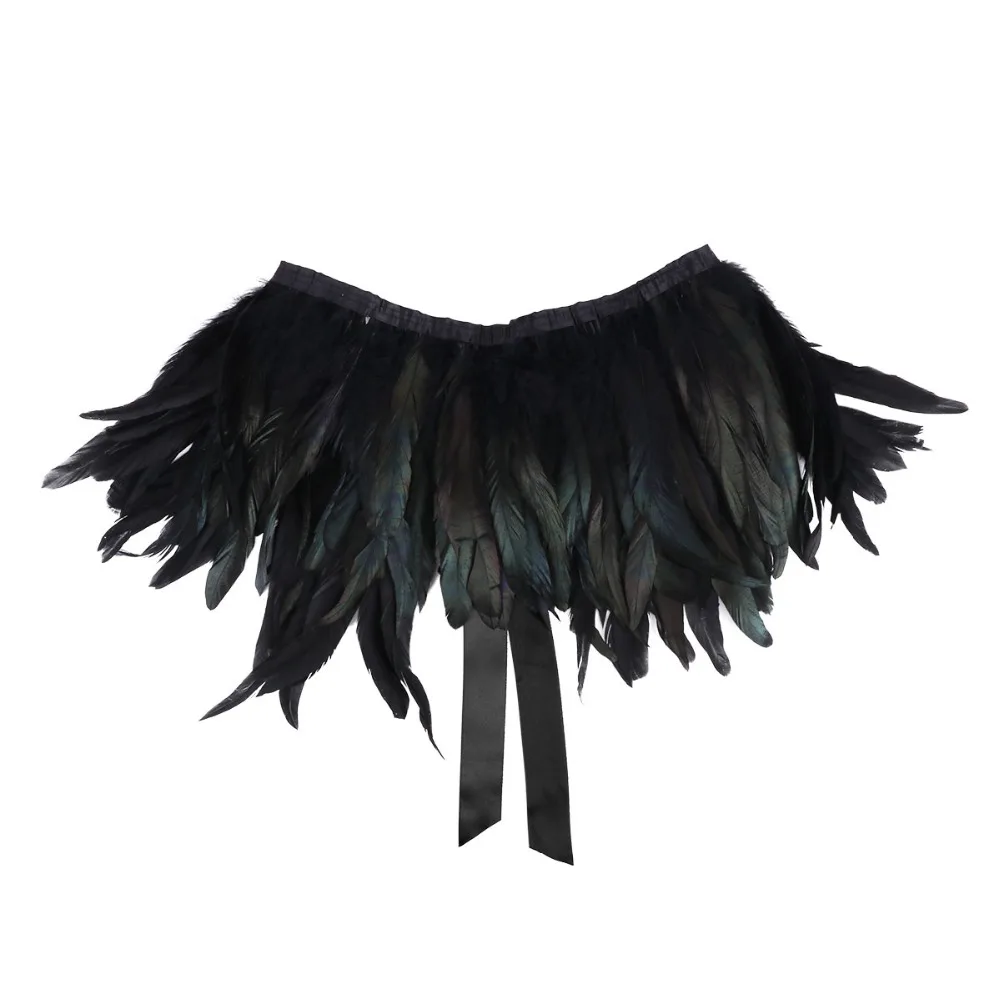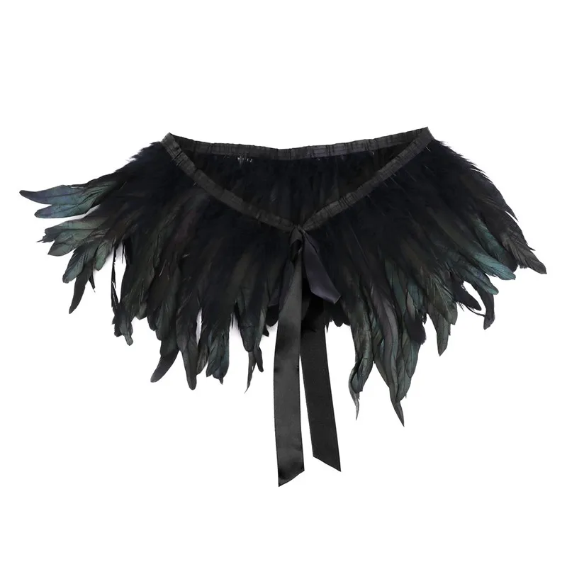 Our Iridescent Natural Feather Cape is made with dyed rooster feathers. It comes with adjustable black satin ribbons in front of the feather. It is breathable and allows you to move freely. Our Iridescent Natural Feather Cape is very comfortable to wear when worn around the neck or shoulder. Order yours today!