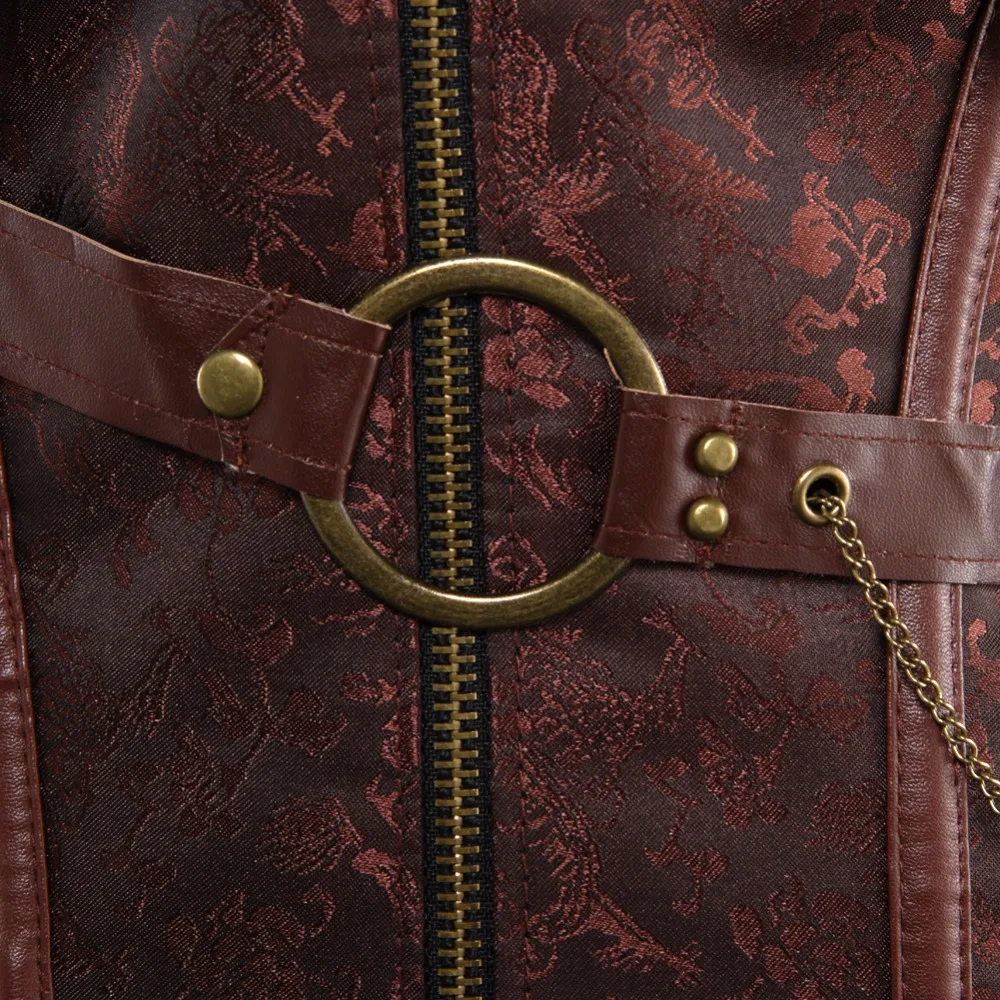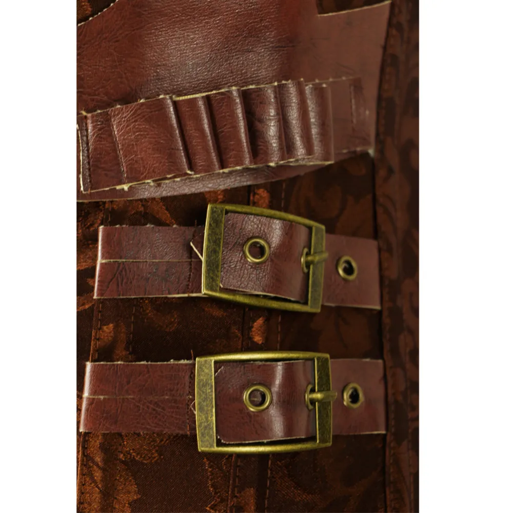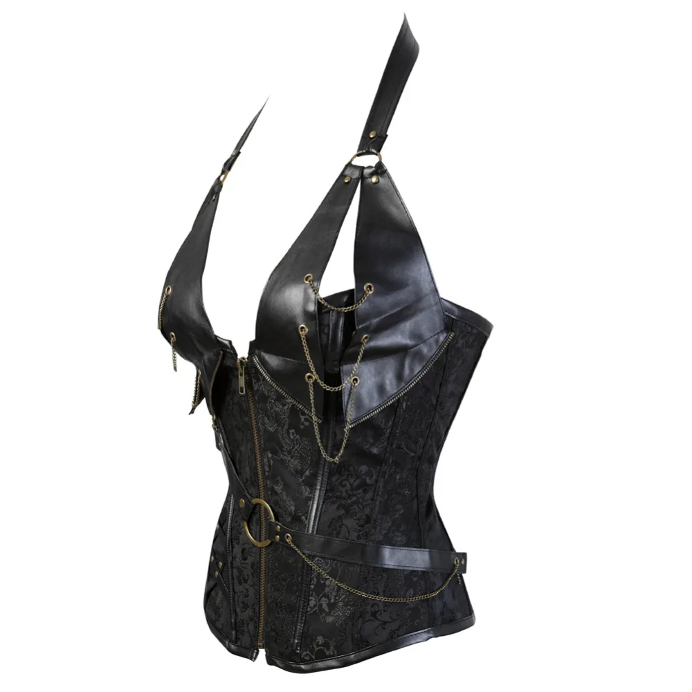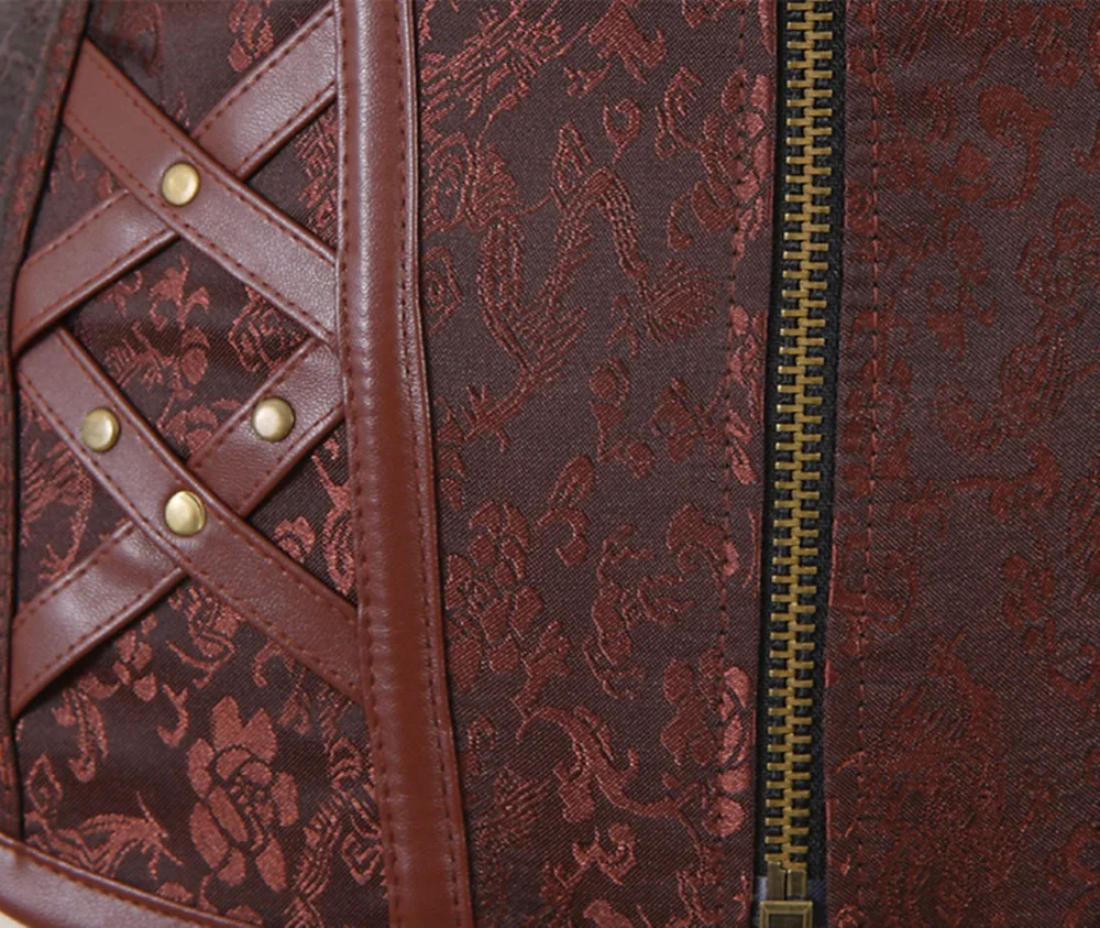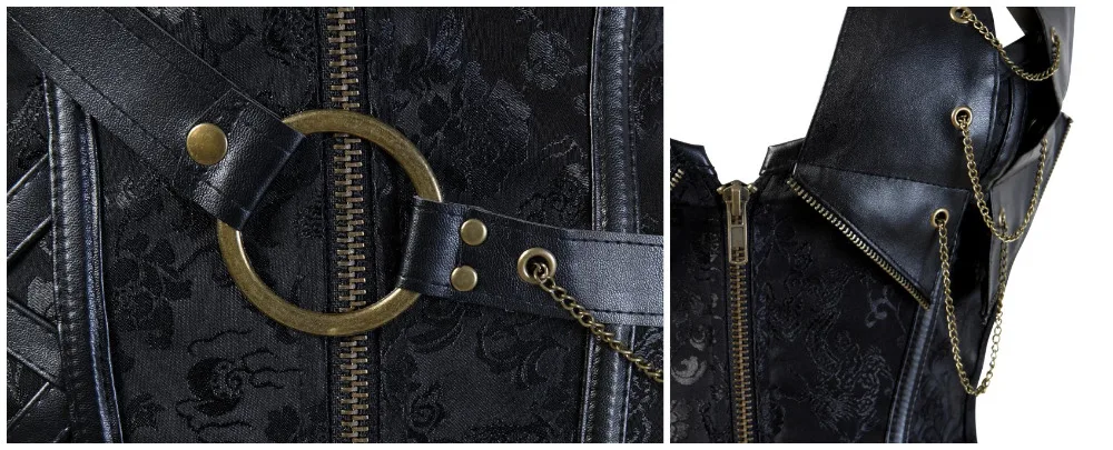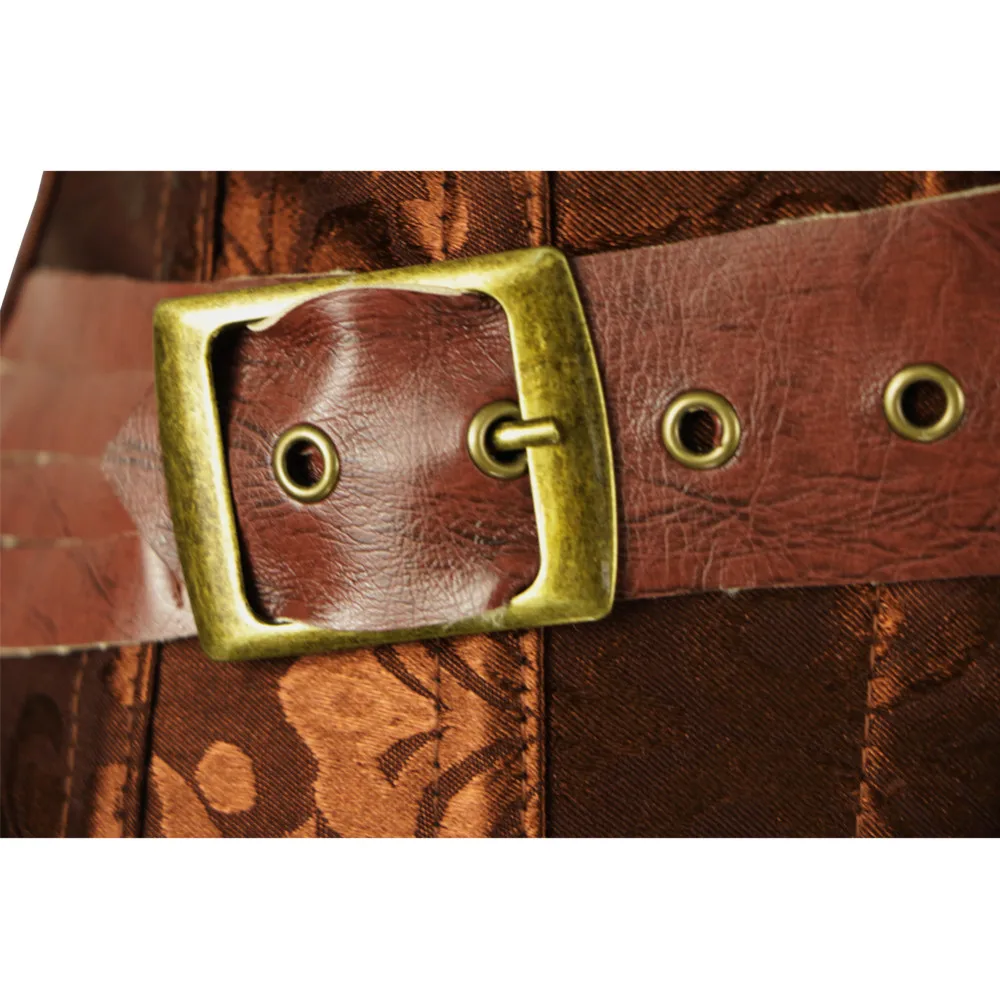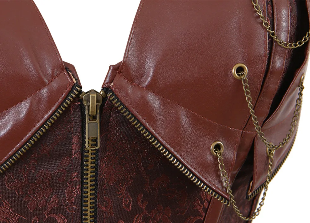 This faux leather Medieval inspired overbust steel boned corset has a deep plunging neckline which will support your bust and show off your cleavage! The bronze chain detail adds to the medieval look! As this corset is so roomy in the bust we do advise that the style is more appropriate for a larger bust.