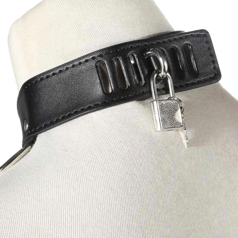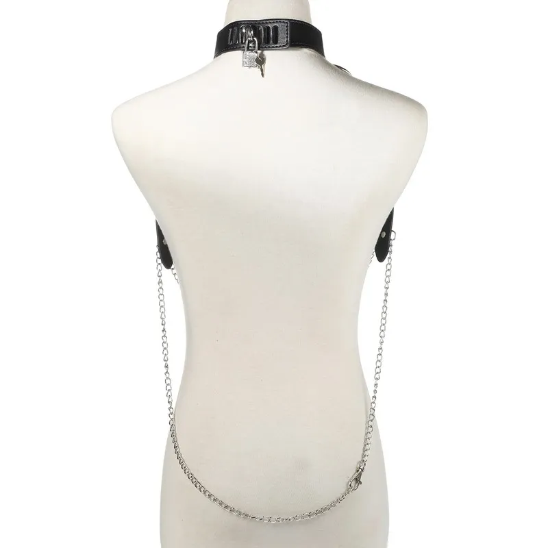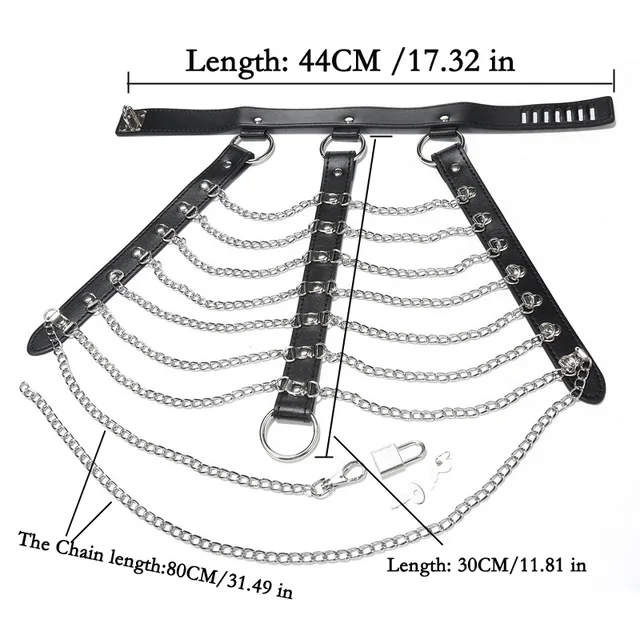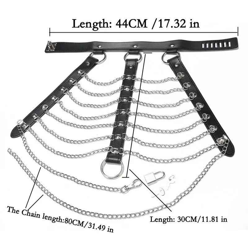 This harness is amazing quality! Came very well packaged. It actually feels like it has some weight to it, but still very comfortable. The neck is roughly 17 and a half inches, the side straps are about 11 inches with the middle strap being 12 inches including the bottom ring. The backing is very soft, almost sued feeling. The lock is decent, it came with 2 keys. You don’t have to use it though since the holes seem to fit snugly around the metal loop and stays in place. Though alot of movement might let it slip off without the lock(haven’t tested this though). The chain that goes around the back is long enough that anyone should be able to wear this, the clasp is also good quality. Very happy with this purchase, would order from again!