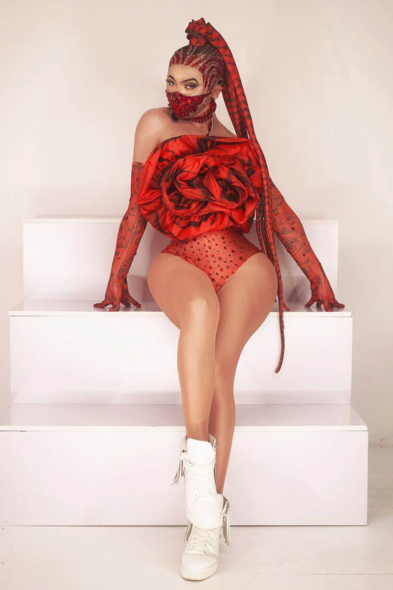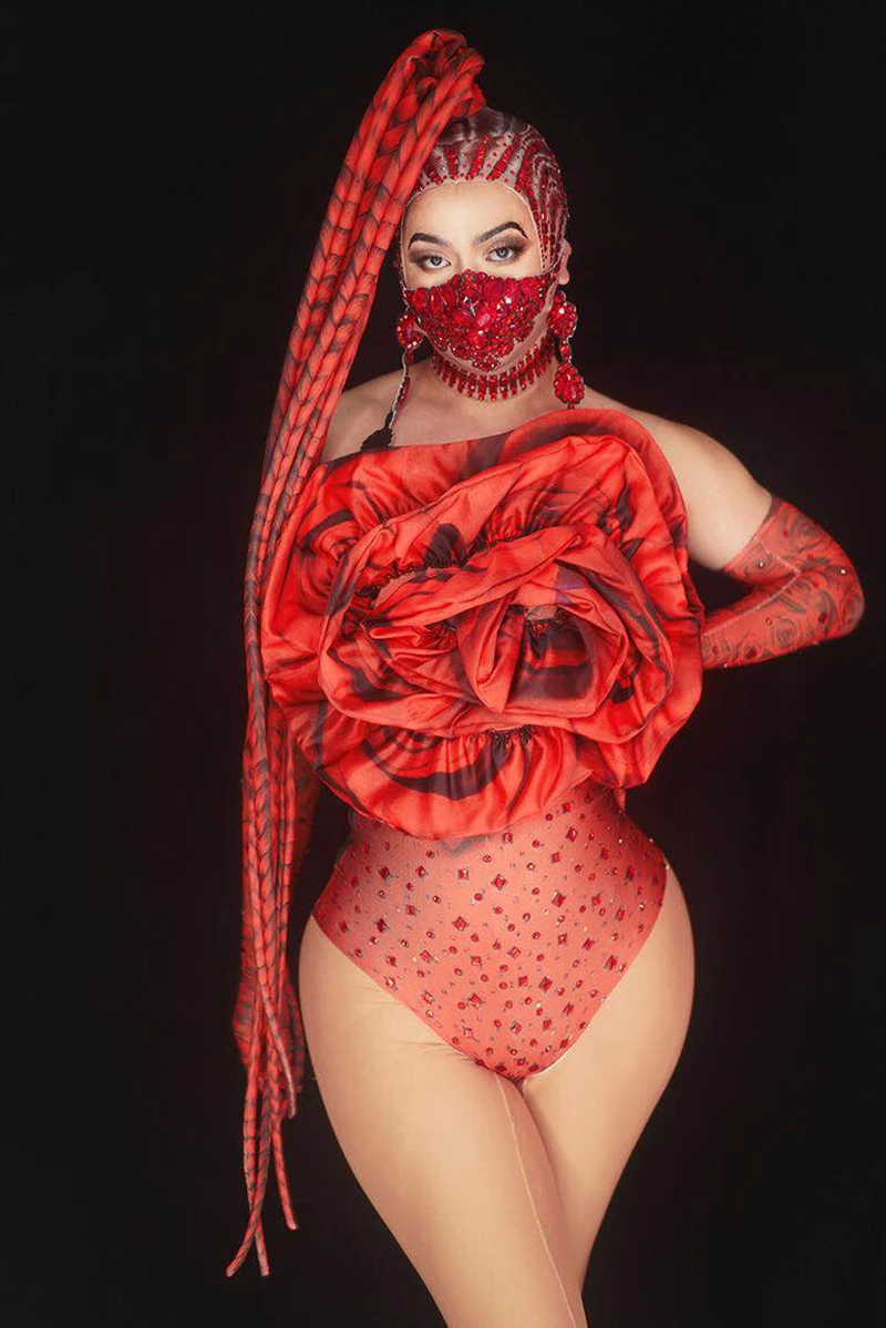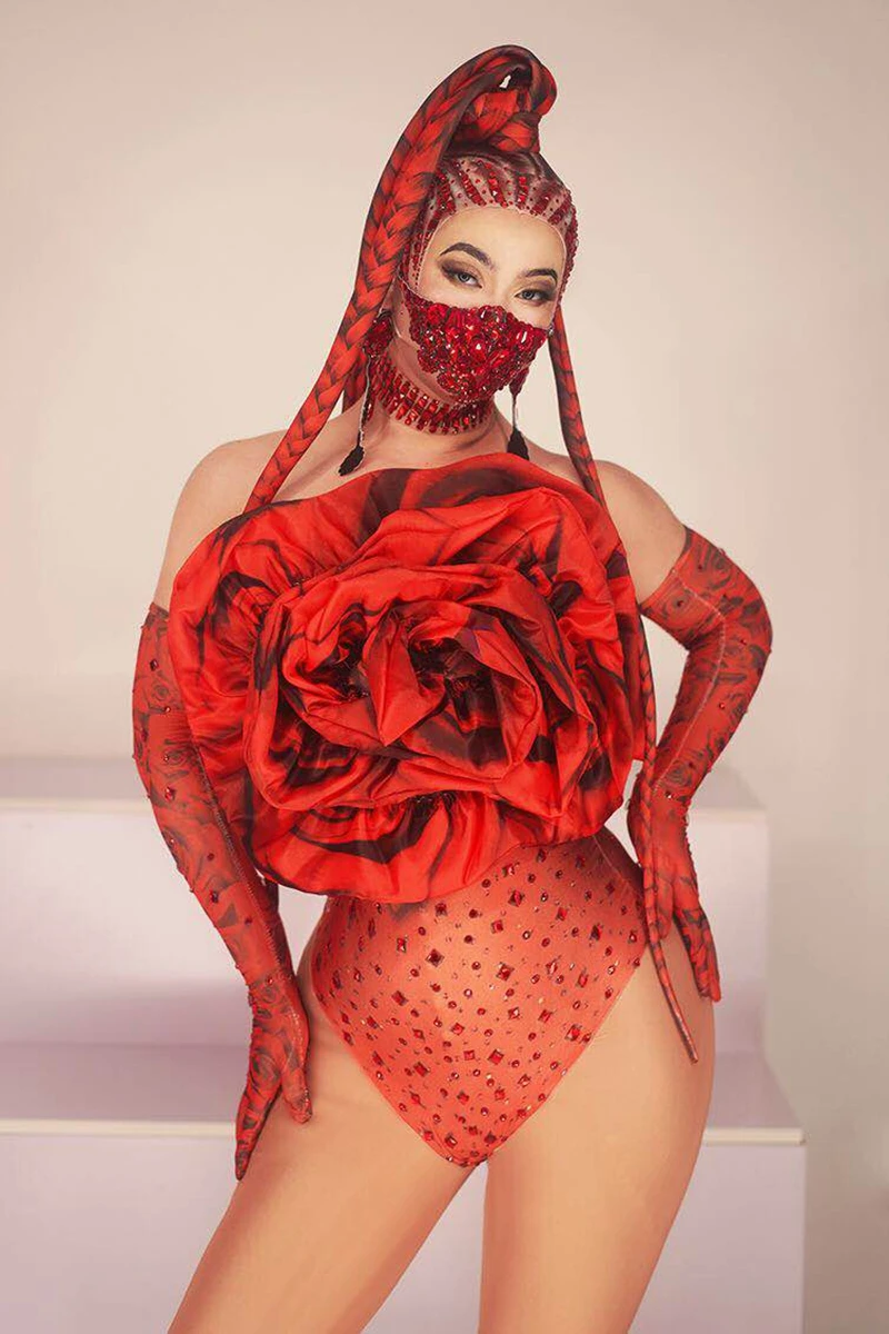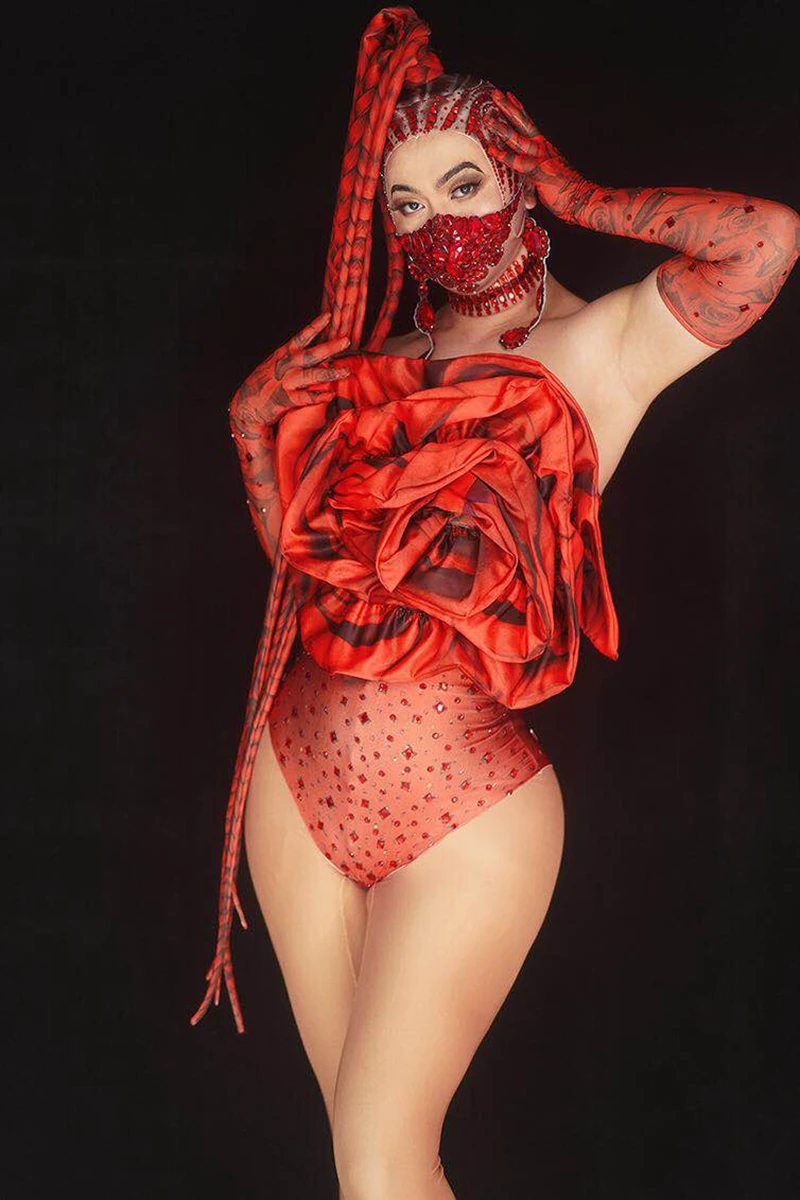 Be the center of attention with our visually stunning  Sexy Red Rose Rhinestone Bodysuit Costume. This set includes a headdress, a mask, and a bodysuit. It makes a great addition to your drag queen closet. Order yours today and get the best deal in Sexy Red Rose Rhinestone Bodysuit Costume.