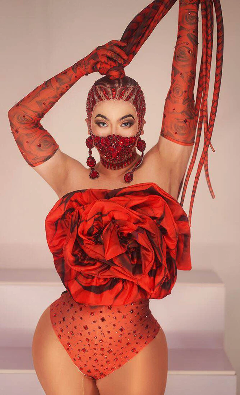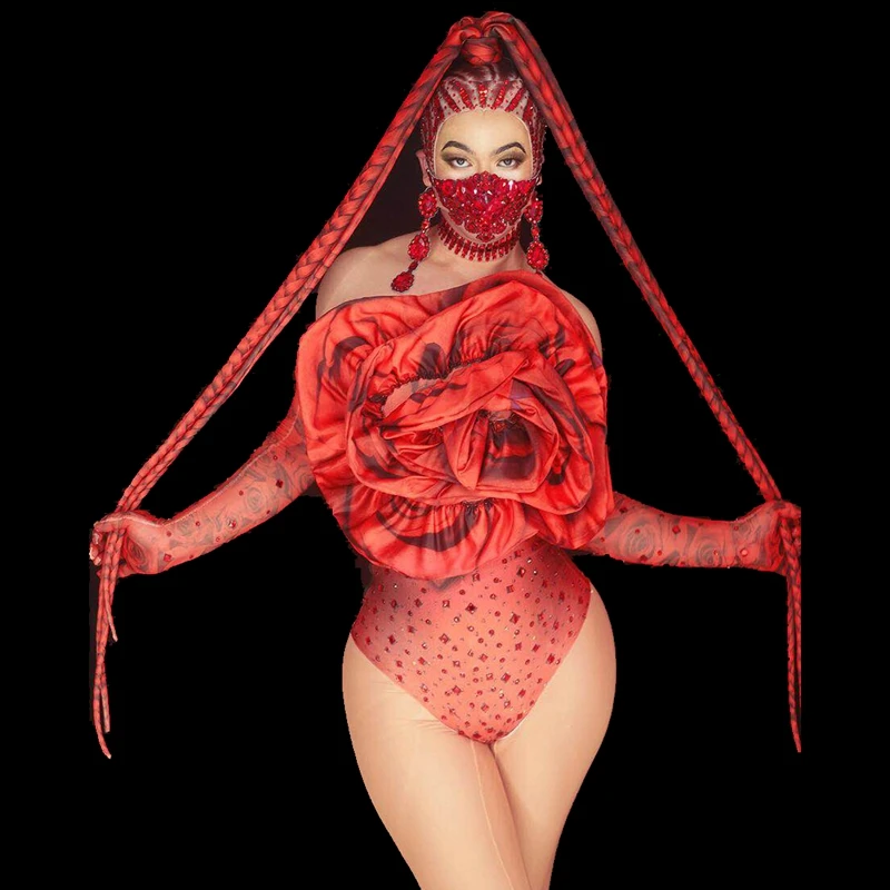 Sexy Red Rose Rhinestone Bodysuit Costume (Set Of 3)