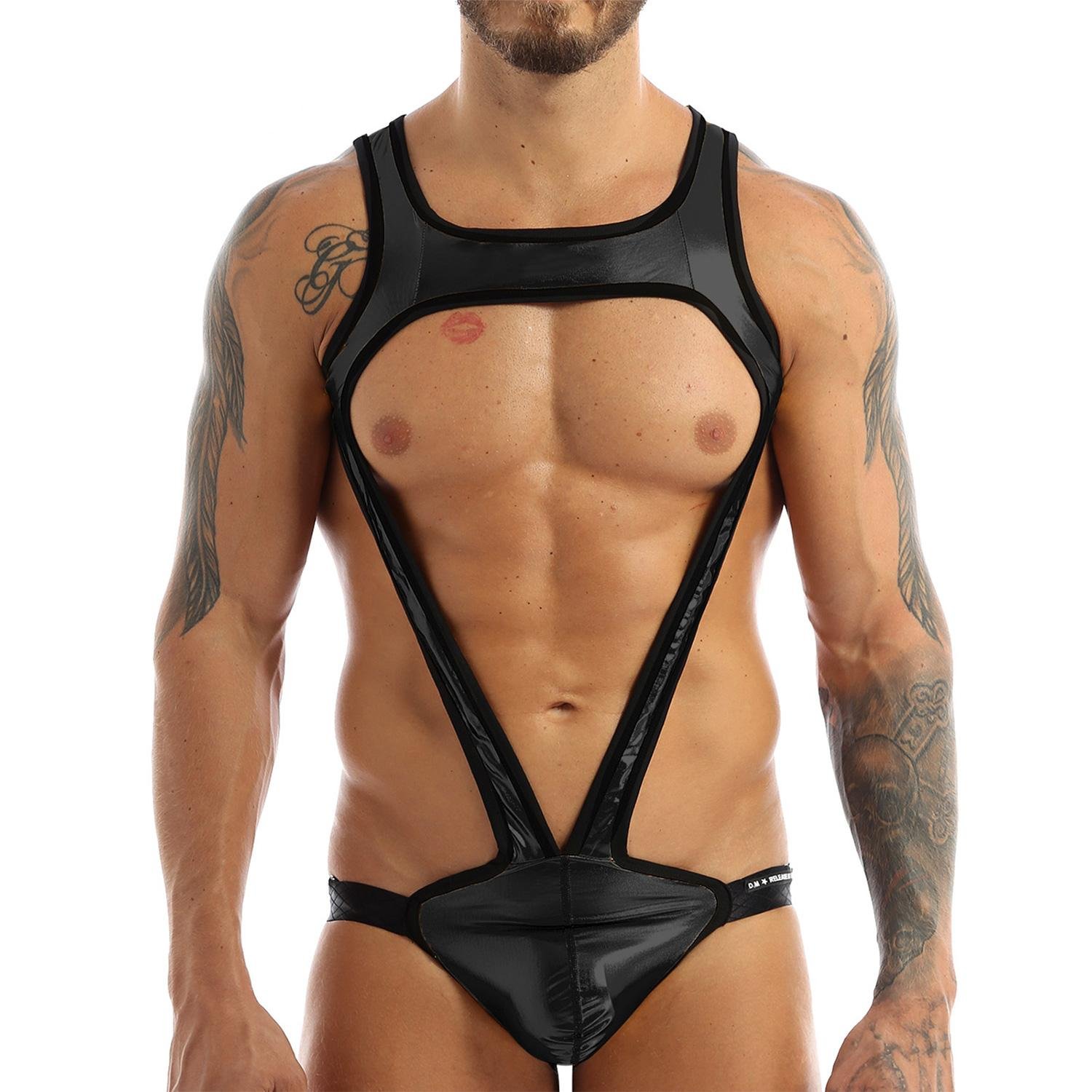 Men’s one-piece shiny metallic jockstrap wrestling singlet leotard mankini bodysuit underwear.