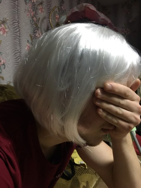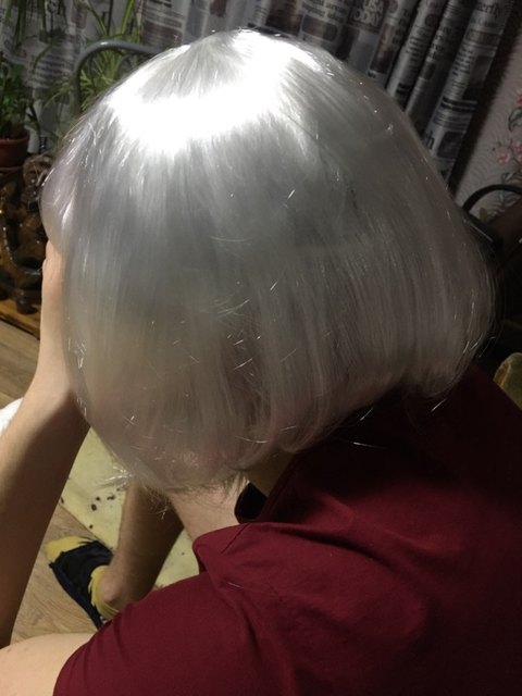 Beautiful silver color. Out of the minuses fall hair and not very smooth haircut. But for such a price a good festive wig.