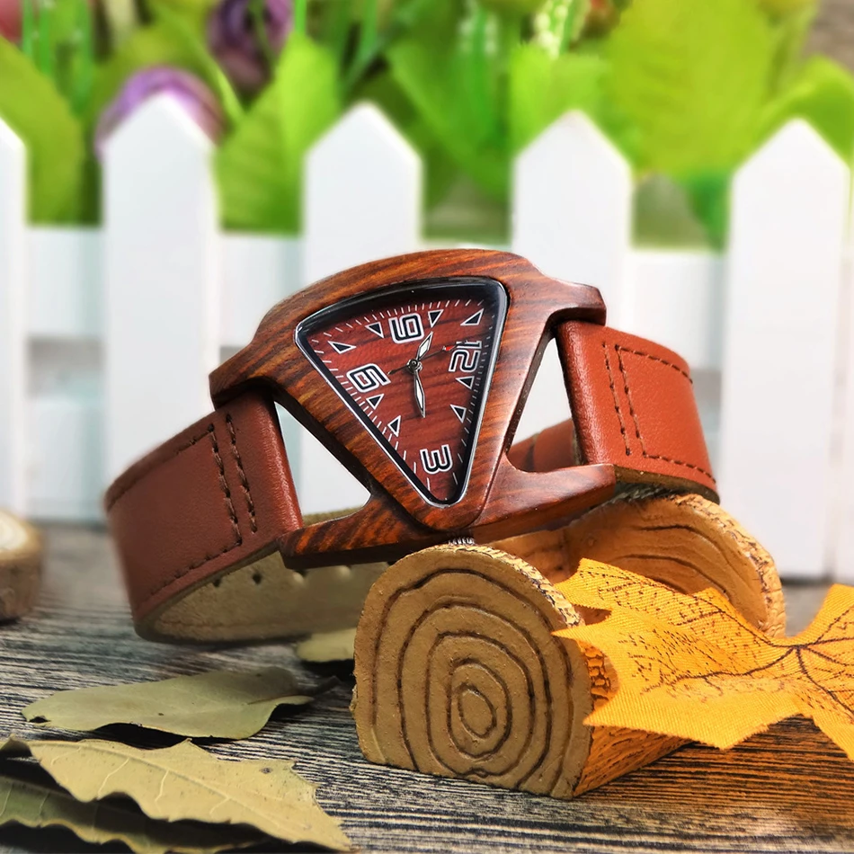 Wooden Triangular Wristwatch With Genuine Leather Band