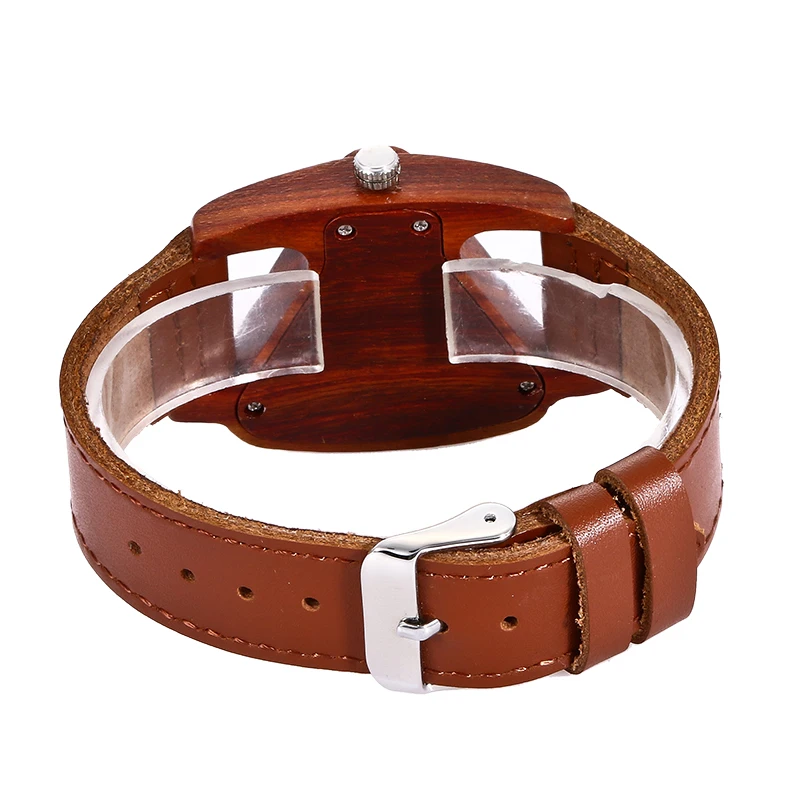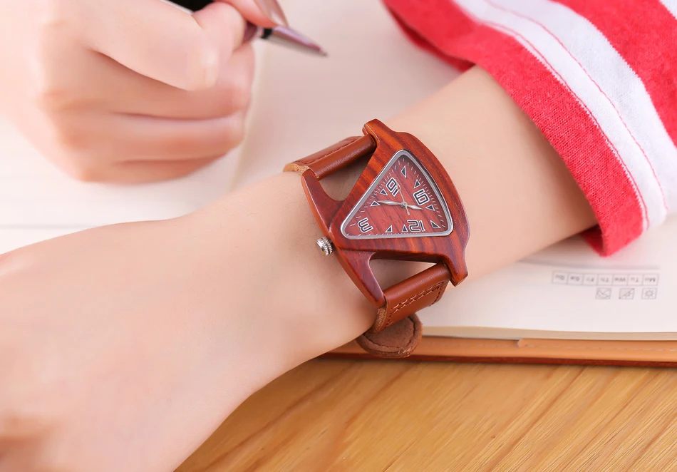 Our Wooden Triangular Wristwatch With Genuine Leather Band is available in three kinds of material: colorful dyed bamboo, natural red sandal wood, and black ebony wood. The band is made of genuine leather. It is very comfortable to wear! Order yours today and get the best deal in Wooden Triangular Wristwatch With Genuine Leather Band.